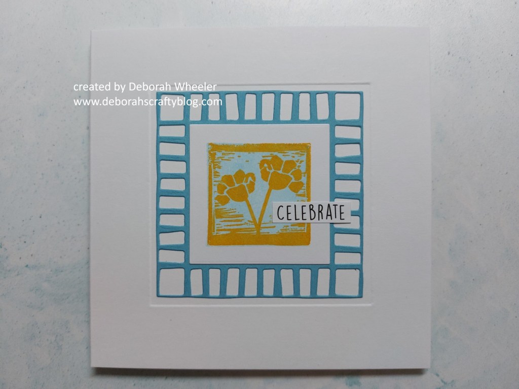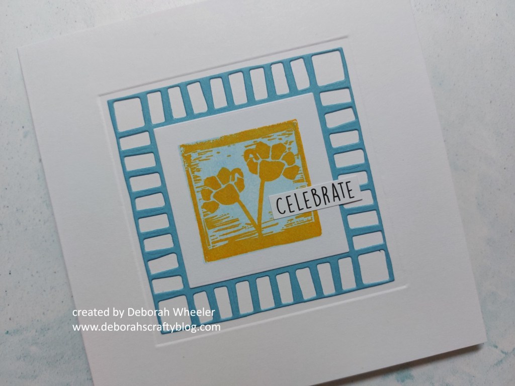I’ve gone with column I for my card, taking square, layers & stamped images. I turned to the ‘linocut A4 sampler‘ stamp set from ClarityCrafts, together with the ‘block print‘ nested frame dies which I haven’t used very much at all but which work really well with the linocut style.