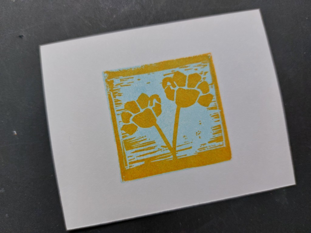 The linocut stamps can be used as an overlay with the solid block one, which is exactly what I did, starting with ‘tumbled glass’ Distress Oxide for the background, then adding the flowers in ‘carved pumpkin’.