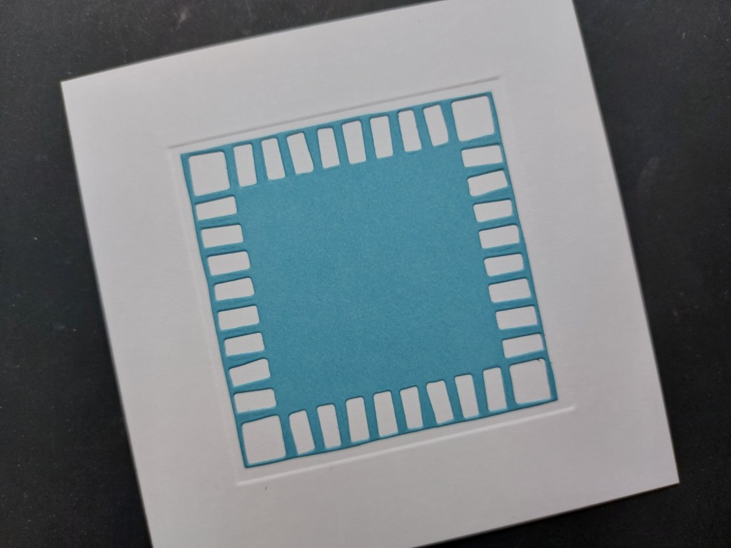 I took a 5×5 card blank and used a small square embedder to emboss a frame on the front before attaching a piece of Waimea Falls companion paper that I’d cut with the middle one of the ‘block print’ dies.