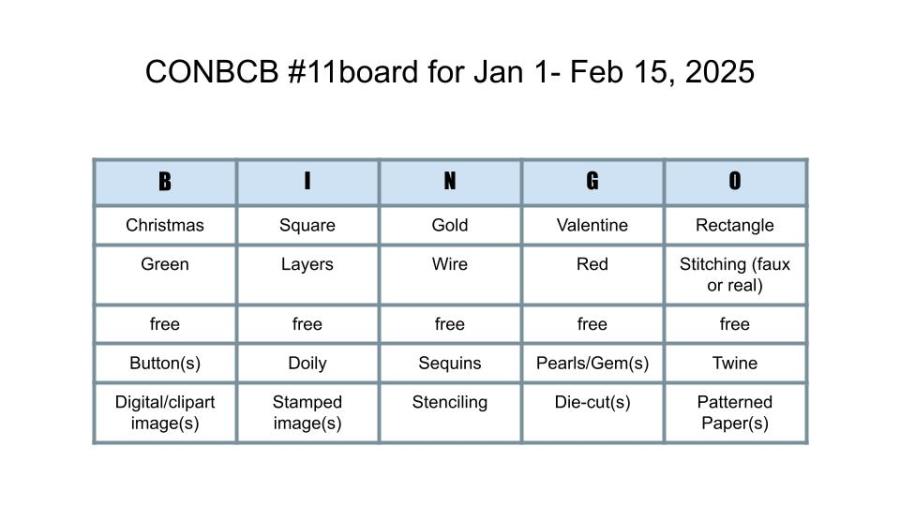 Hello again! Ist of January and here I am already with a second post, this time sharing our new challenge board at Christmas (or not) BINGO. There’s changes here too, as my bloggy friend Leslie has also stepped back from hosting this challenge too, but thankfully Becca has stepped into the breach. Our boards have been updated for the new year too – you still choose one column and include at least three of the prompts on your card, but now we’ve added in various occasions as well. So here’s our January board to inspire you…