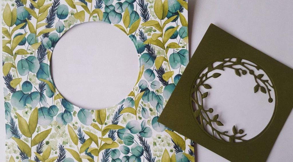I started by die cutting a circle in a piece of the SU ‘Forever Greenery’ designer paper, and used the leafy circle from the ‘Birds & More’ dies to cut a piece of coordinating card that would sit inside the circle.
