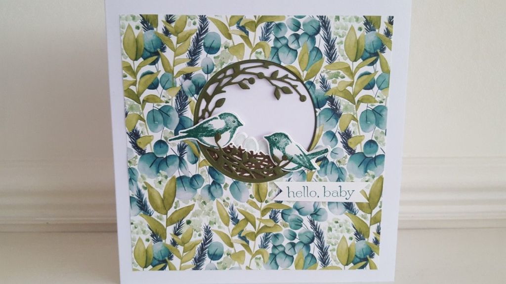 Hello, and welcome to my little crafty blog. I’m sharing a card I was asked to make for someone at work who is about to go on maternity leave. I thought the ‘Birds & Branches’ set from Stampin Up! was perfect for this, with the birds still having their eggs in the nest