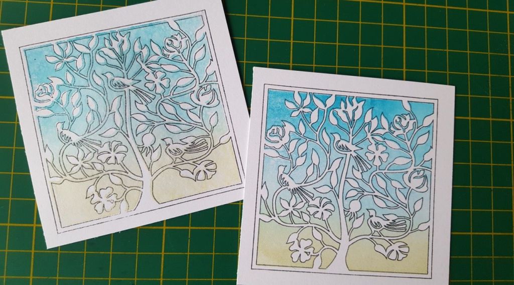Having stamped the card, there was still some ink on the stamp. I’ve seen Barbara Gray from Clarity then spritz the stamp with water to loosen the ink and get a second image from it. So that’s what I did – but I think I was a bit liberal with the water spray as the ink bled on the card! I do quite like it though. The first generation stamp is on the right in the photo below, and the second generation spritzed with water is on the left
