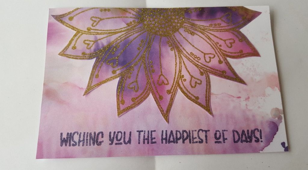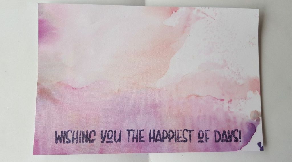 I then cut the remaining piece of paper to size and stamped the sentiment along the bottom edge, using ‘eggplant’ from Adirondack. I love the way these colours tone together