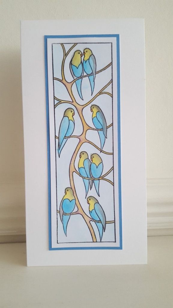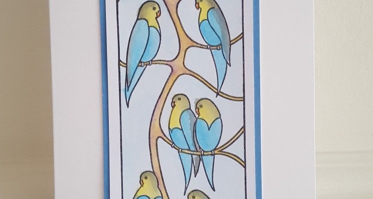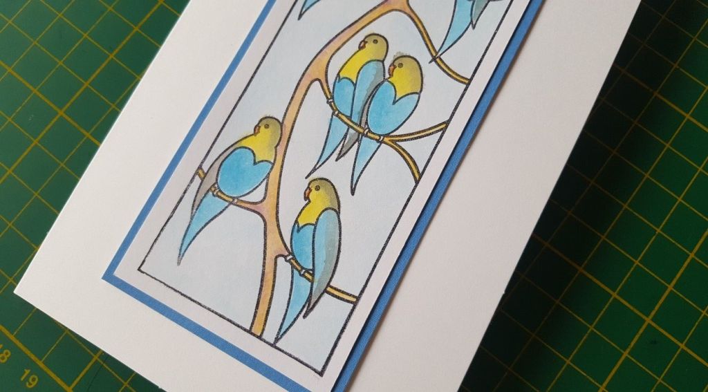 I then coloured in the branches and the sky, before mounting the topper onto a blue mat to lift out the colours of the birds. I know my watercolouring needs to get a bit better – no doubt practice will make perfect