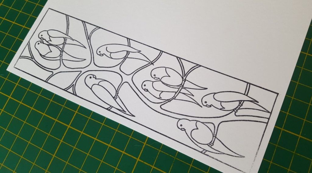 I started by stamping the large parakeet stamp onto white card. You can probably see in the picture that I didn’t get the bottom corner of the image stamped sharply, but I managed to rescue it by using a black micron pen to fill in the outline