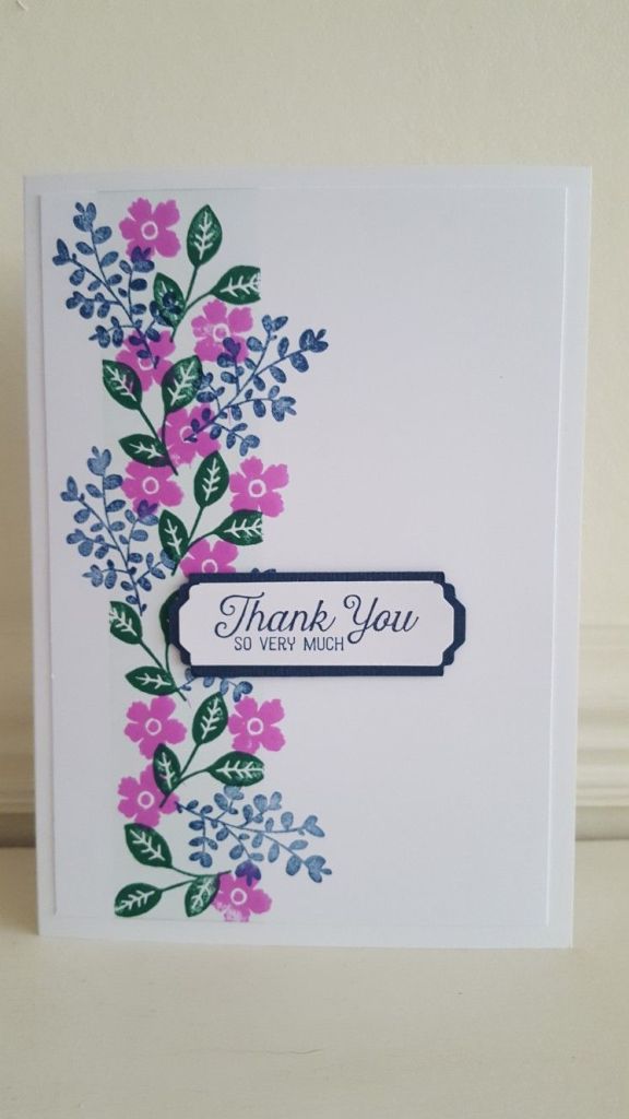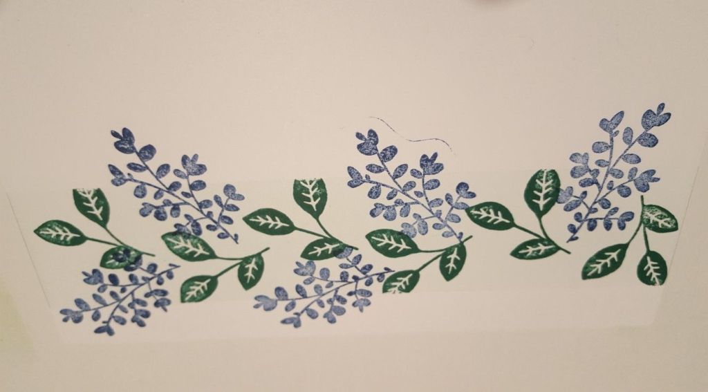 I then stamped the leaves from the Stampin Up ‘Lovely You’ set in Adirondack ‘bottle’, randomly along the panel. At this point I decided to take the masking tape off, so that I could get leaves fanning out from the side, rather than having a straight line.