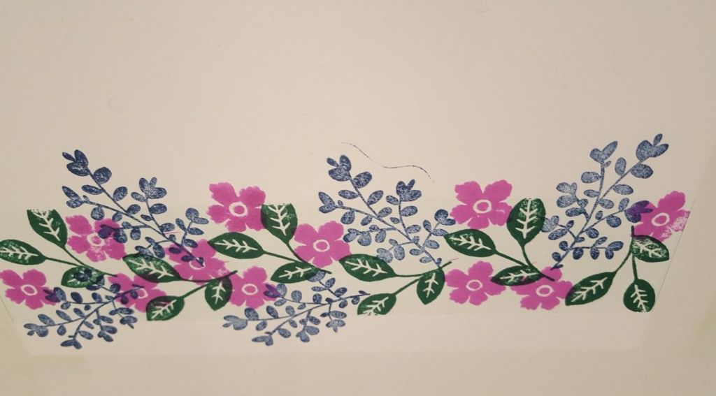 I then added the leaf spray from the set along the panel, using Adirondack ‘denim’, and then the small flowers in Adirondack ‘raspberry’. I do like the way these colours look together