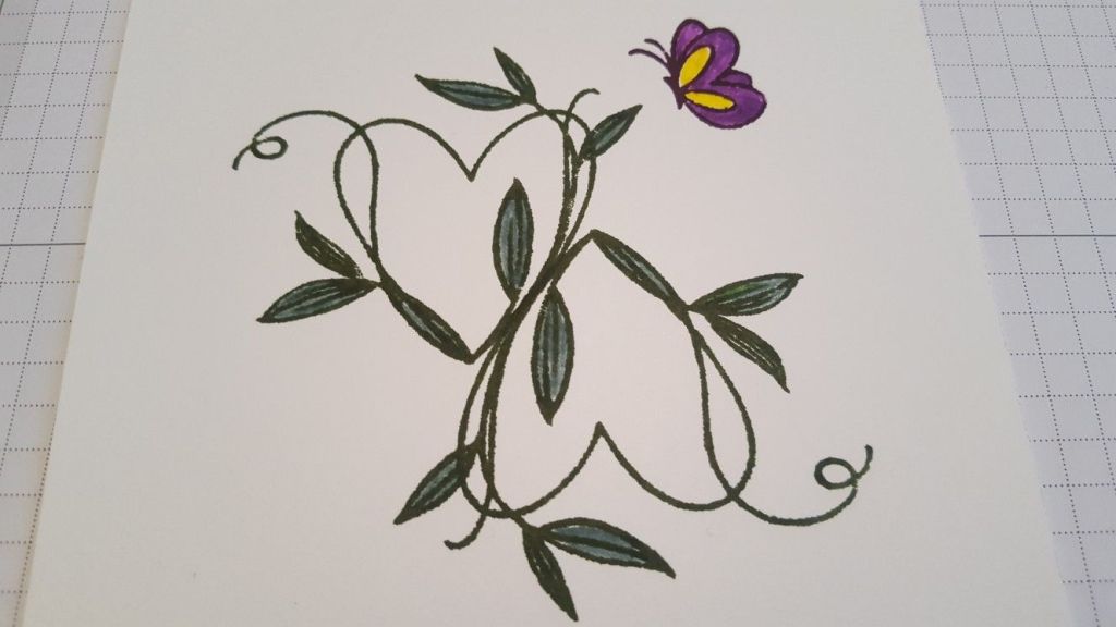 I stamped the butterfly from the set in purple, and then coloured it and the leaves in using Pergaliner pens