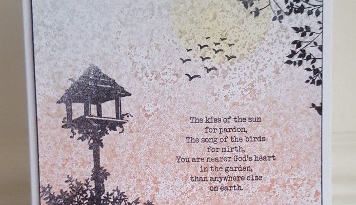 I went back to another of my favourite stamps – the ‘birdhouse garden’ from Claritystamp. It’s such a great set for creating scenes. I started by stamping the bird table on the lower part of the card, and then added some leafy branches in the top corner from the ‘fly away’ stamp set