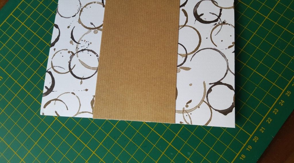 I started by cutting a piece of paper from the co-ordinating designer paper to cover a 5×7 card blank. I then put a piece for kraft paper across the centre of the card to form a panel, to set the coffee cups against.