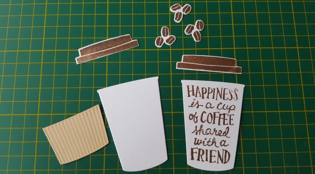 I then stamped and cut out the two coffee cups, the lids, the card sleeve and three sets of coffee beans