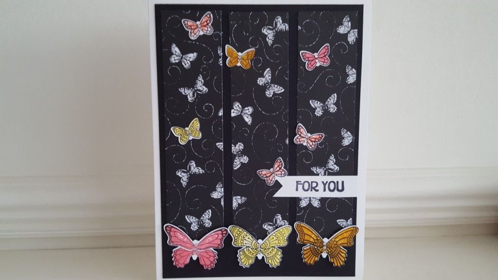 I’ve used a black base for the card, as I wanted the colours of the butterflies to stand out. I started by stamping the butterflies in pink, yellow and orange, together with a few extra small ones in peach. I then cut a piece of black card for the card front, together with three strips of the black & white butterfly paper to sit the large butterflies against