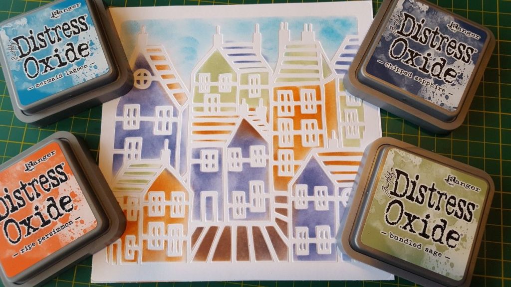 I kept the stencil on the card, and then used sponges and Distress oxides to dab colour through the stencil and highlight the houses and sky. It’s impossible to do this without getting inky fingers, but it gives a great effect, and you can blend the colours together.