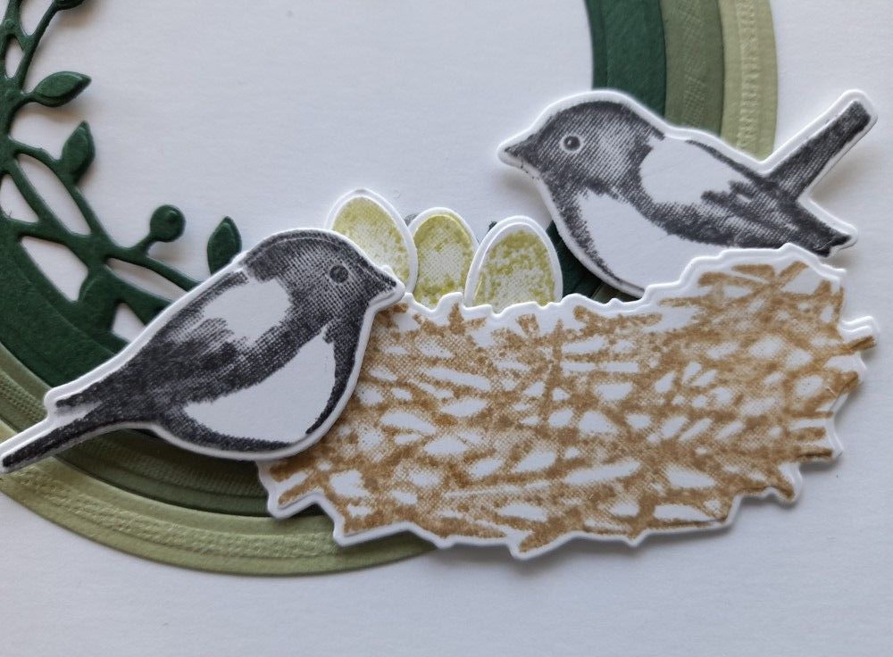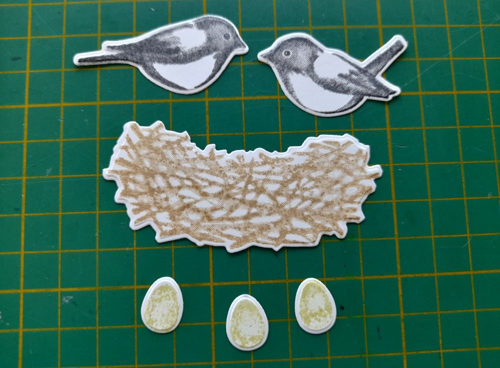 I then stamped & cut out the two birds in grey, the nest in a kraft colour, and the eggs in a pale green.