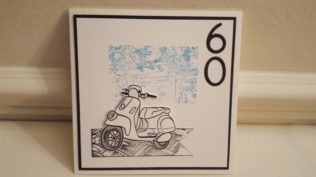I finished the card by mounting the square onto a 6×6 card blank, and then fixed the Vespa in place using foam pads. As it’s his 60th birthday (don’t shout it too loudly!), I die cut the numbers out of spare black card and put them in the top corner.