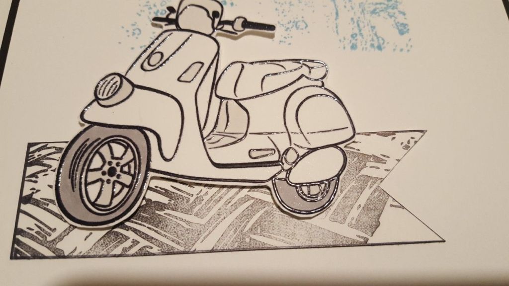 Welcome to my crafty blog. Today’s card is one I made for my brother-in-law’s birthday – he’s got a white Vespa scooter, and I remembered I’d got one in this old set of stamps from Kanban buried in my stash. I’ve also used the current challenge from Fab Friday for the design (http://fabfridaystampinchallenge.blogspot.com/)