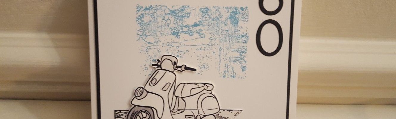 Welcome to my crafty blog. Today’s card is one I made for my brother-in-law’s birthday – he’s got a white Vespa scooter, and I remembered I’d got one in this old set of stamps from Kanban buried in my stash. I’ve also used the current challenge from Fab Friday for the design (http://fabfridaystampinchallenge.blogspot.com/)