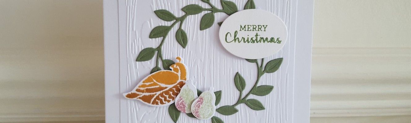 Welcome to my crafty blog. I’ve been busy making more Christmas cards, and love this ‘Arrange a wreath’ set from Stampin Up, with the co-ordinating ‘wreath builder’ dies. As it’s still a way from Christmas yet, it didn’t feel appropriate to get too far into the song, so I stuck with the first day of Christmas and the partridge in a pear tree (are you singing it yet…?). I based the design on this week’s TGIF blog challenge over at http://tgifchallenges.blogspot.com/