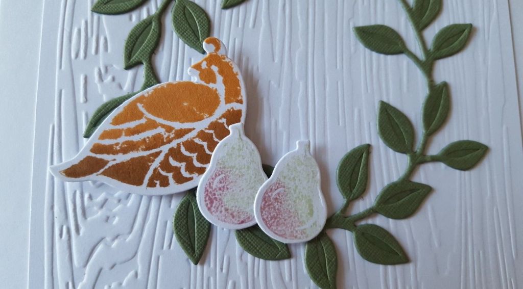 Next was to stamp out the partridge and two pears and die cut them. I blended the inks on both stamps using make up sponges to dab the highlights, before stamping. And I know that the partridge isn’t very accurate for colour (all my birdwatching friends will be shouting at me!), but hey-ho… Once cut out, I attached them to the lower left side of the wreath using foam pads.