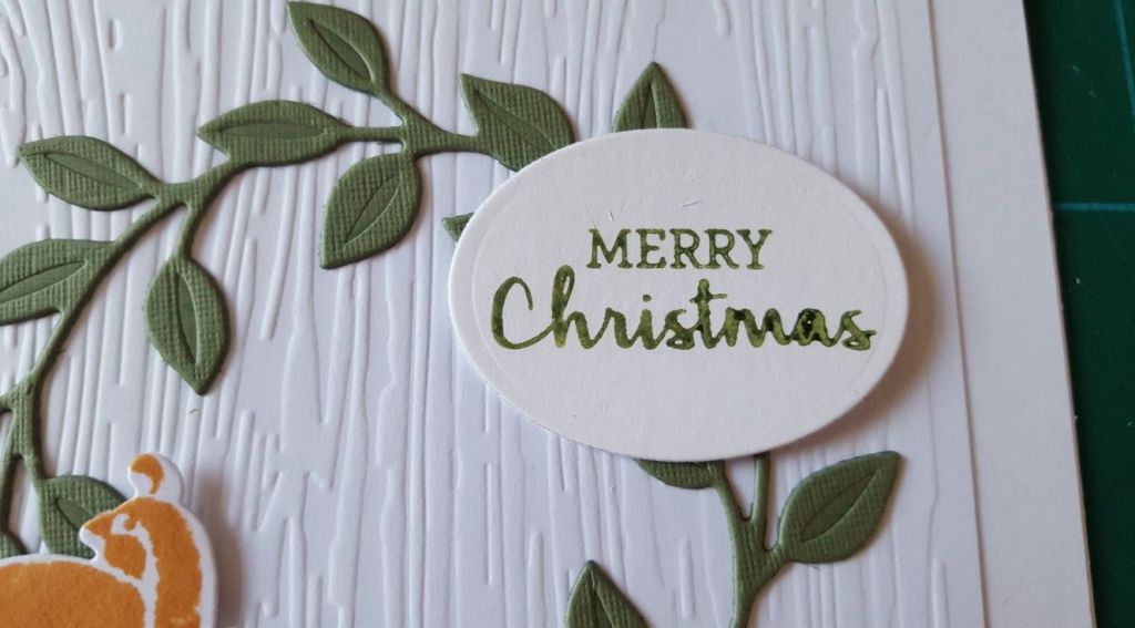 Finally, I stamped out the ‘Merry Christmas’ sentiment from the set in a dark green, and die cut it into an oval, before attaching it to the opposite side of the wreath