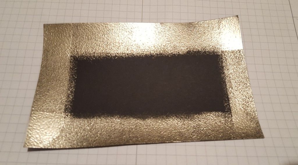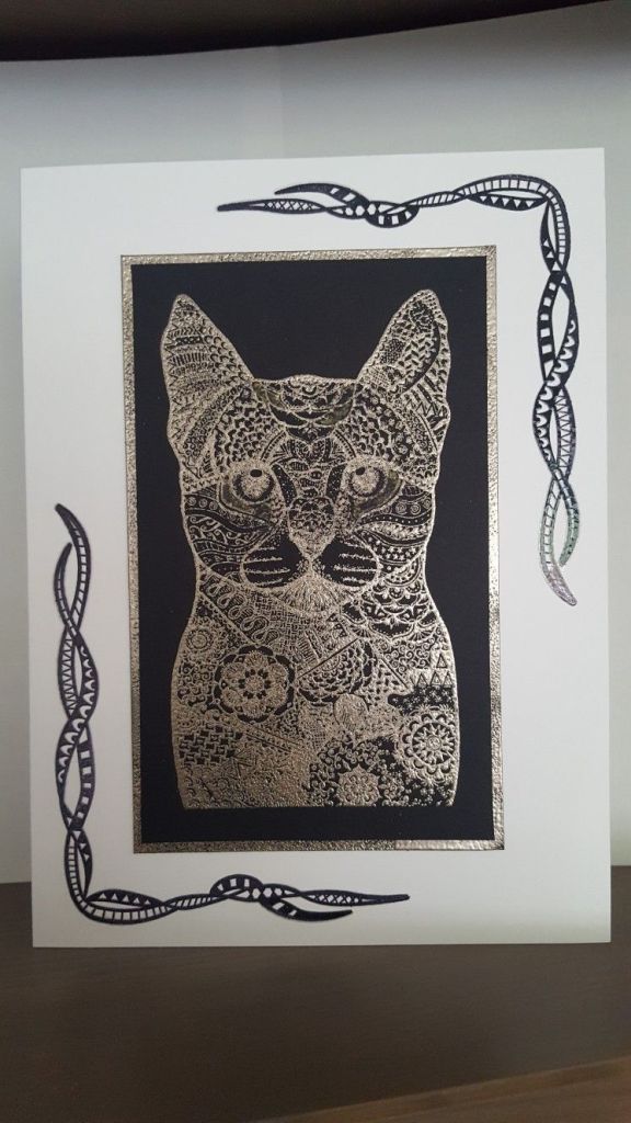 I then mounted it onto another piece of black card, which I’d edged by just pressing the inkpad and embossing with the metallic platinum powder round each side in turn.