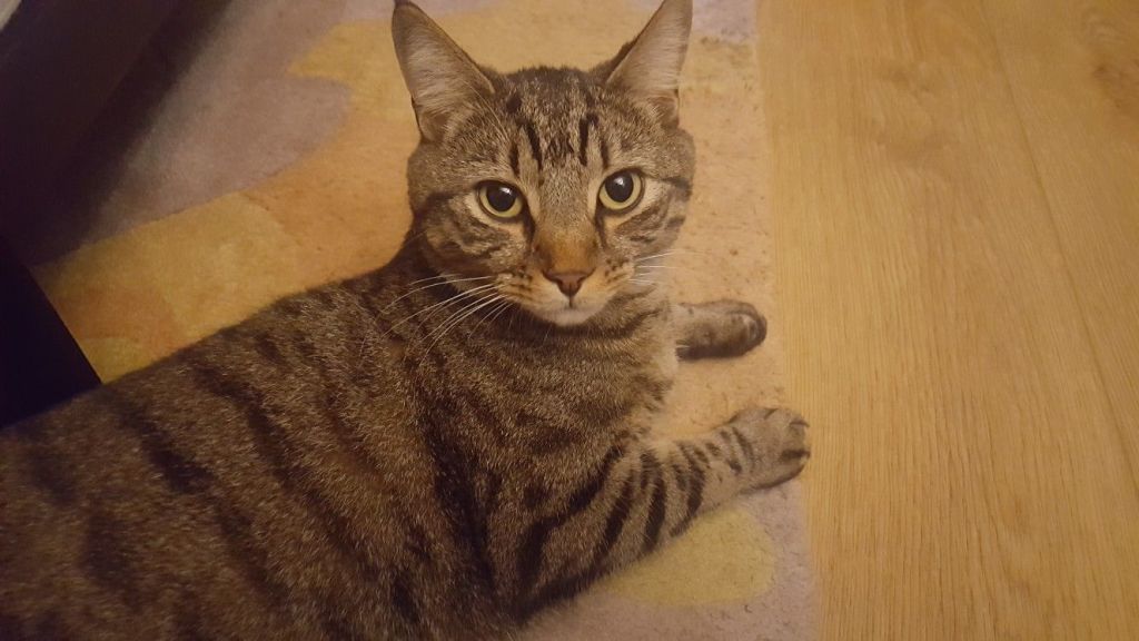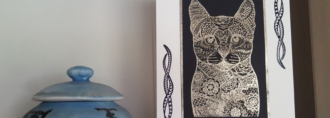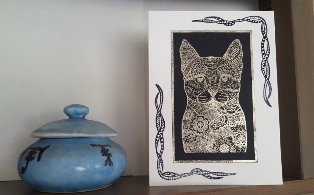 Welcome to my crafty blog. I wanted to share the birthday card I made for my son, who owns a very elegant tabby cat called Benji. I bought this lovely stamp from Crafty Individuals especially for his card – I’ve pictured it with a pot my son painted for me when he was small, and below here’s Benji himself as well