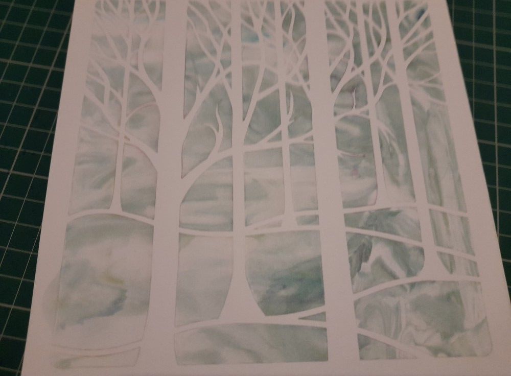 I used the Claritystamp ‘treescape’ stencil for this one, and started by blending drops of bottled Distress inks into some shaving foam and mixing them together. I used Chipped Sapphire, Peeled Paint, Peacock Feathers & Tattered Rose.