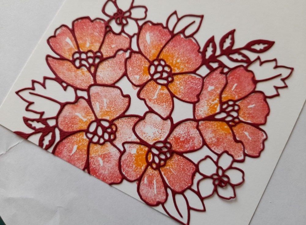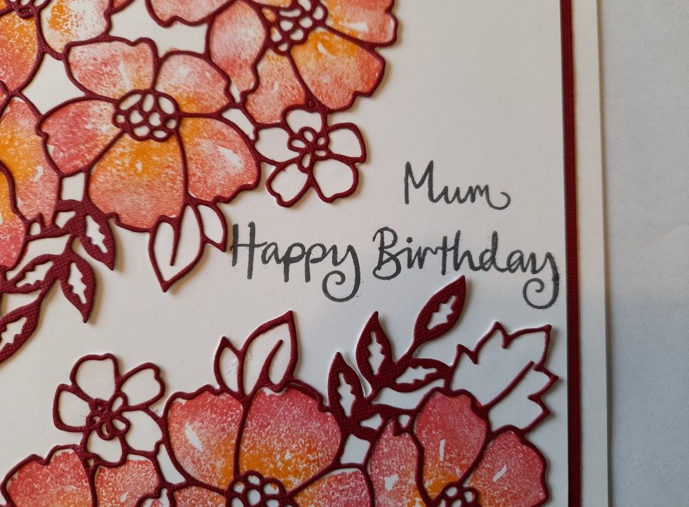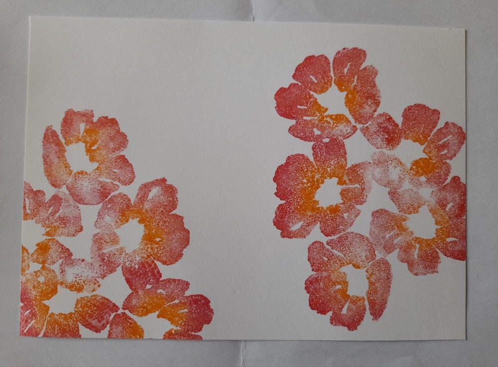 I started by stamping the large blossoms onto the top and bottom of a piece of white card, which I’d already cut to fit on an A5 card blank. I blended the inks on the stamp (I used ‘blaze’ and ‘orange popsicle’ from Artistry Inks) using a make-up sponge before I stamped it on the card. I have to say, I do always seem to get just as much ink on my fingers as I do on the card when I’m doing this…!