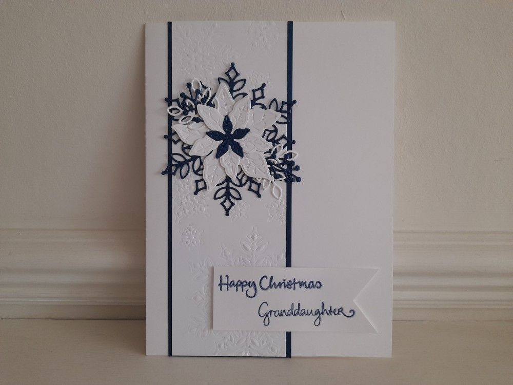 I then die cut the largest snowflake in the die set from the blue paper, together with the smallest poinsettias from the new ‘poinsettia’ dies set – two of them in white and the smallest in blue. I was given a tip recently about how to get deeper embossing when using die cuts, which is to spritz the card with water before die cutting it. It definitely worked on these poinsettias.