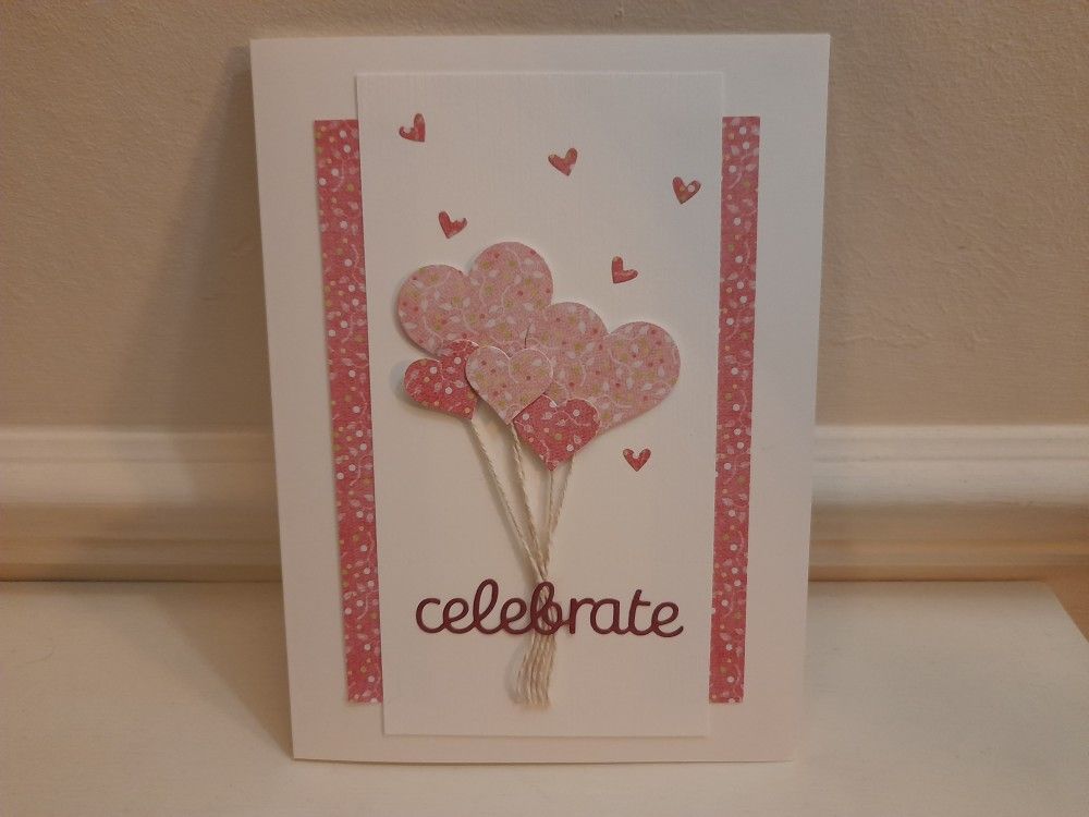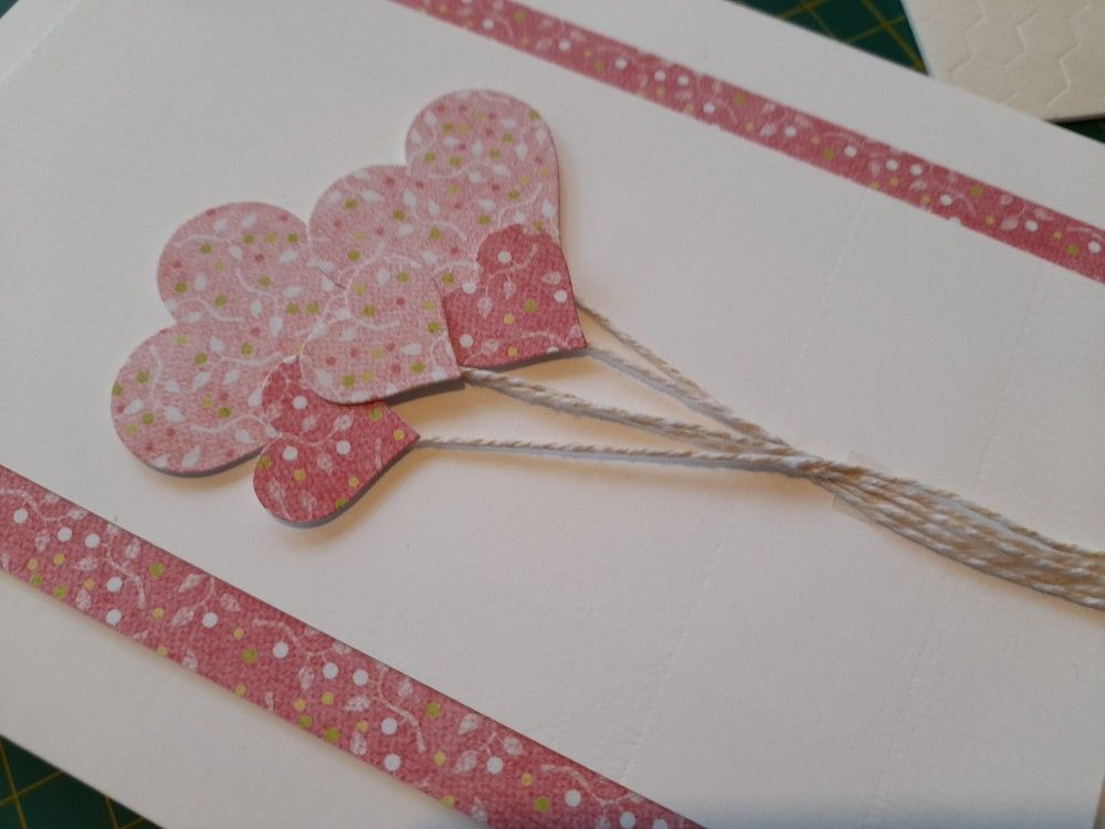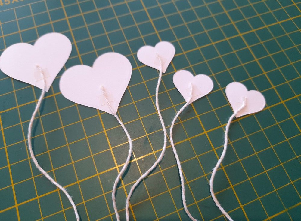 I wanted to make them look like a bunch of balloons, so just taped a length of bakers twine onto the back of each heart, so I could draw the strings together once on the card