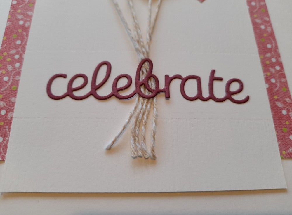 I pulled the strings together on the card, and used a small piece of red tape to attach them further down the card front. I then added the die cut sentiment across the top of the strings.