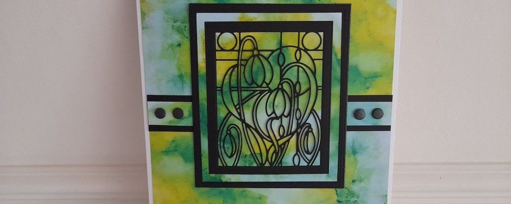 Welcome to my crafty blog. Today’s card is quite a bit bigger than the ones I usually make – it’s on an A4 card blank as it’s a farewell card for a friend from a group I belong to, so lots of space for people to write their good wishes. I’ve used the glorious ‘snowdrops’ die from Claritystamp’s art nouveau collection as the centrepiece – I love the stained glass effect of these dies.