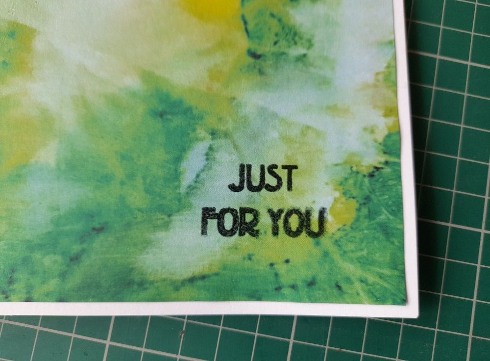 At this point I stamped the sentiment in the lower corner of the backing paper. I wanted to heat emboss it with clear powder, so that the black stood out more, so needed to do that before I taped it to the card blank.