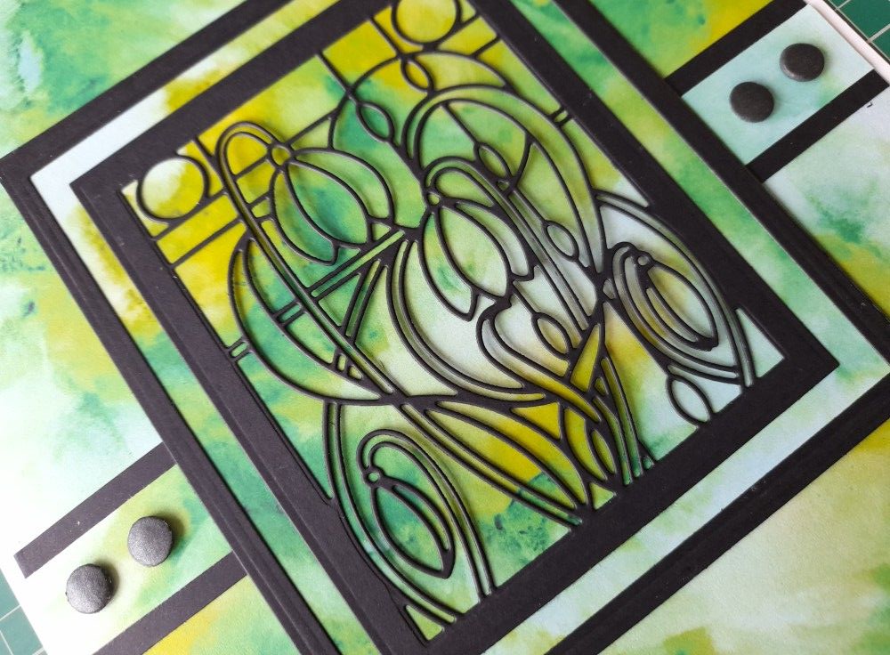 The backing papers are from Claritystamp’s new ‘Amazonia’ set – the greens and yellows are so vibrant and I thought would set the black card off really well. I started by cutting the snowdrops from black card, and used the nested rectangle dies to cut it out with a frame, and then cut a larger outer frame. I mounted both pieces onto one of ‘Amazonia’ 5×7 cards, cut down to size, and then went round the edge with a black Sharpie to hide any white cut edges.
