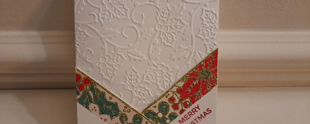 I decided to emboss the front of the card, using a holly leaves folder I’ve had for ages. Once embossed, I attached the two triangles to the bottom front of the card