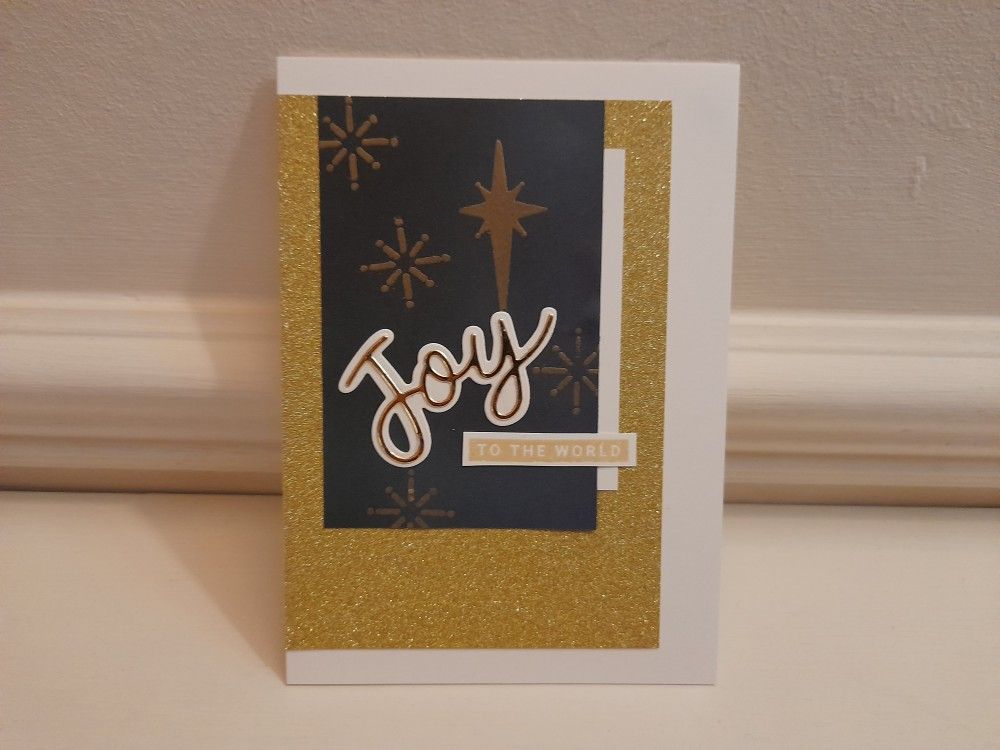 Next was to cut out ‘joy’ in gold card, and the backing mount in white. I also stamped ‘to the world’ and embossed it with the WOW powder before trimming it down to leave a narrow white border. These both then sat nicely on the front of the card