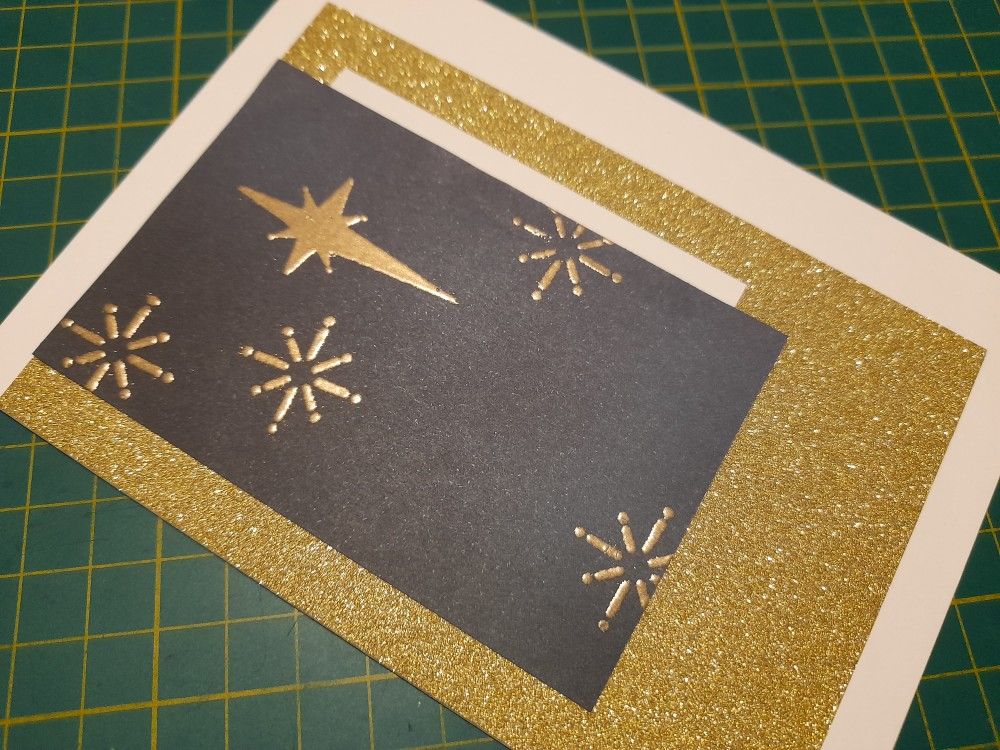 I started this card by stamping some stars onto a piece of dark blue paper and heat embossing them with WOW powder in gold satin pearl. The smaller stars are from the SU ‘Peace and Joy’ set, and the larger one is from Claritystamp. I then attached a strip on white card onto the side before mounting the starry paper onto a larger piece of gold sparkle card and then an A6 card blank