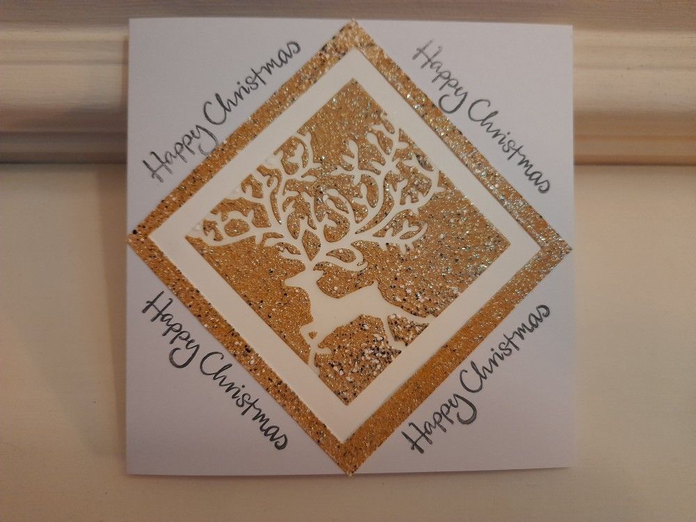 I then cut a piece of double sided adhesive acetate to fit across the back of the die, and stuck it over the card pieces, so that I could pick the whole scene out of the die. It takes a bit of rubbing on the back to make sure all the small pieces have been picked up, but it’s well worth the effort. I then peeled the card out of the die, and attached it to a piece of white card. The original die cut image then shows as white through the acetate. Obviously, you can’t leave it sticky (you’d never get the card out of the envelope for one thing!), so I dusted it with talcum powder as I wanted a matte finish on the stag. Alternatively, fine glitter is a great way to cover up the adhesive