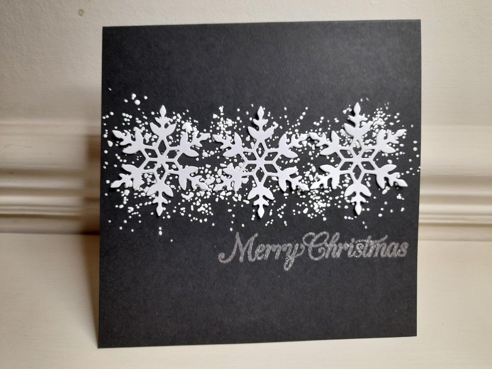 Finally, I die cut three snowflakes in white card, using one of the dies from Stampin Up’s ‘so many snowflakes’ set. I popped a dab of glue in the centre of each snowflake and then aligned them across the snowy panel