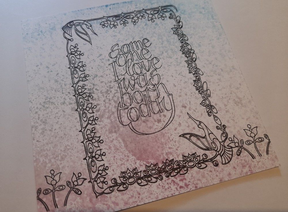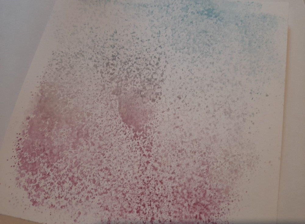 I started with a piece of Clarity stencil card that I’d used to mop up ink from my blending mat when I’ve been watercolouring. I’ve got quite a few of these inky backgrounds in my stash. This one is pink and blue (I must remember in future to write the actual ink colours on the back of the card), so that set the colour scheme for me.