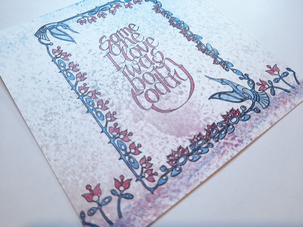 I matched the colours with my Spectrum Noir pencils, and then sat shading the frame, flowers and sentiment. A very relaxing way to spend a half hour. All I then needed to do was run a black Sharpie around the edge of the topper and mount it on a 6×6 card blank