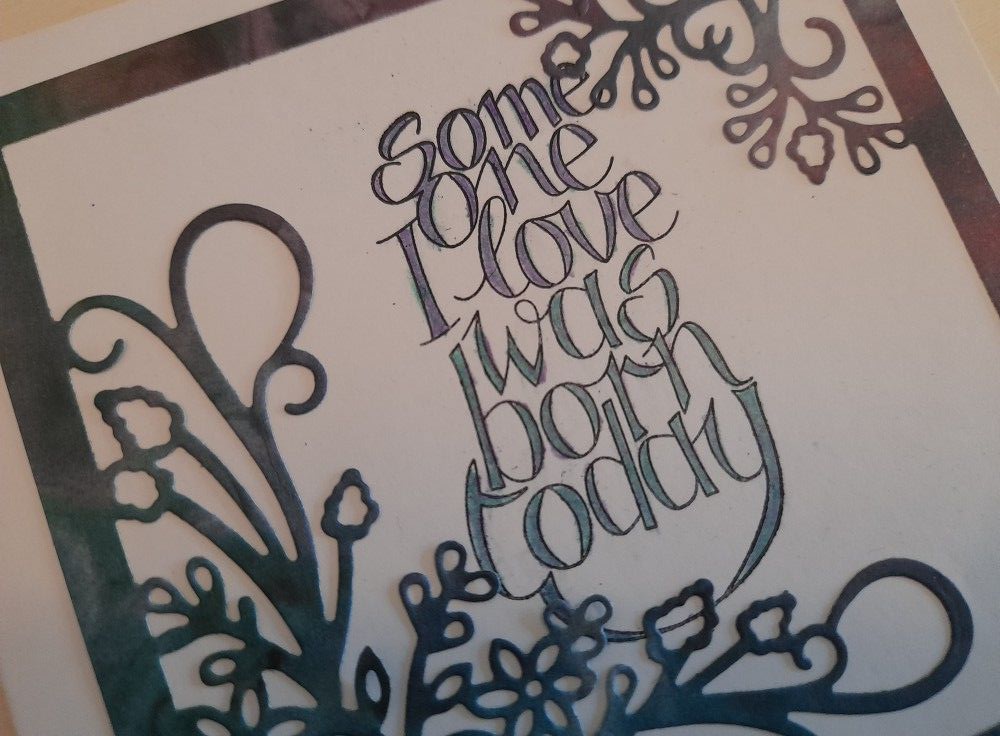 I then stuck the floral frame onto the card. I went back to my Spectrum Noir pencils and found co-ordinating green & purple to colour the sentiment. A fairly quick & easy card.