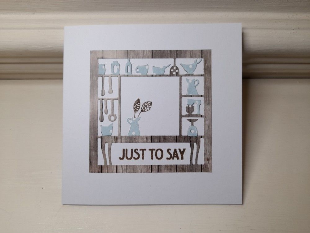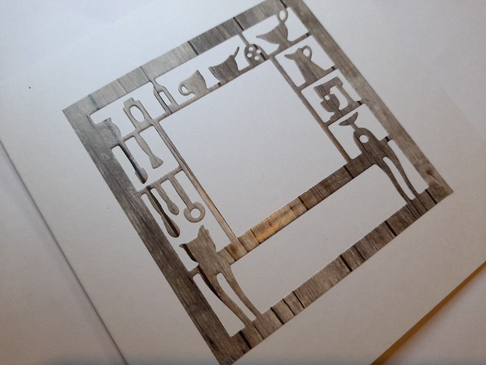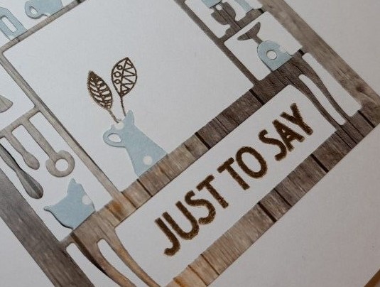 I started with the kitchen dresser die, and cut it out of some wood effect paper that’s been sitting in my stash for longer than I care to remember! I attached it to a 5×5 card blank to form the base for the design
