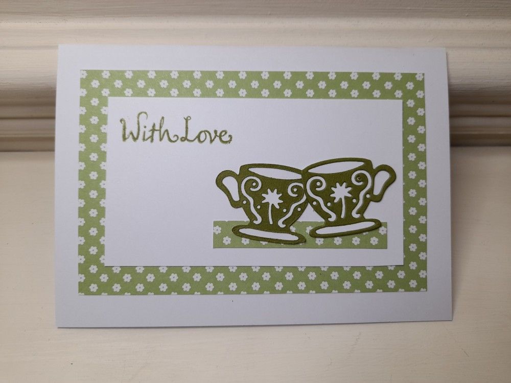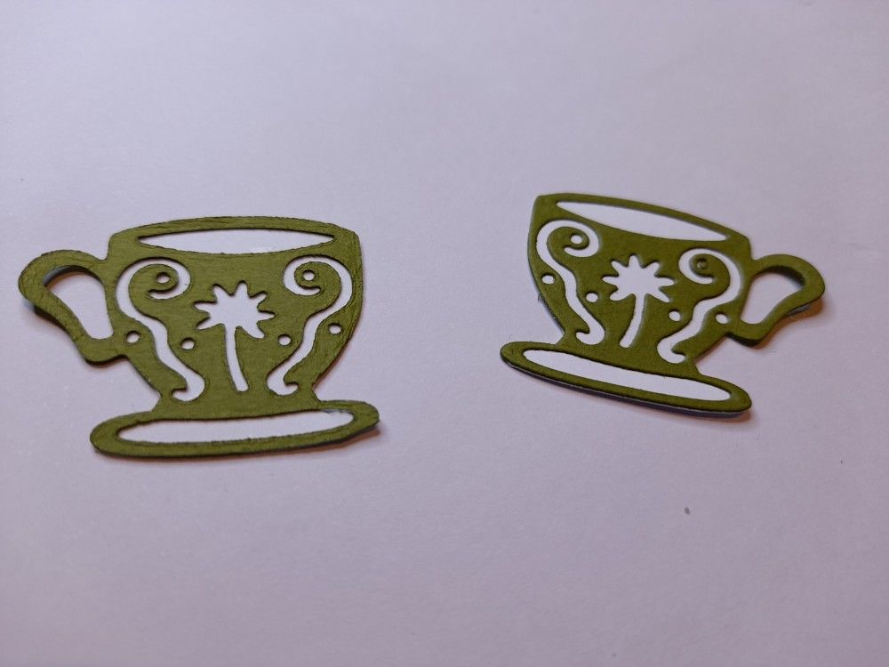 For the second card, I die cut the cups from some scrap green card, and then glued them onto white card before cutting them out with scissors. I turned one of the cups over, so they off set each other