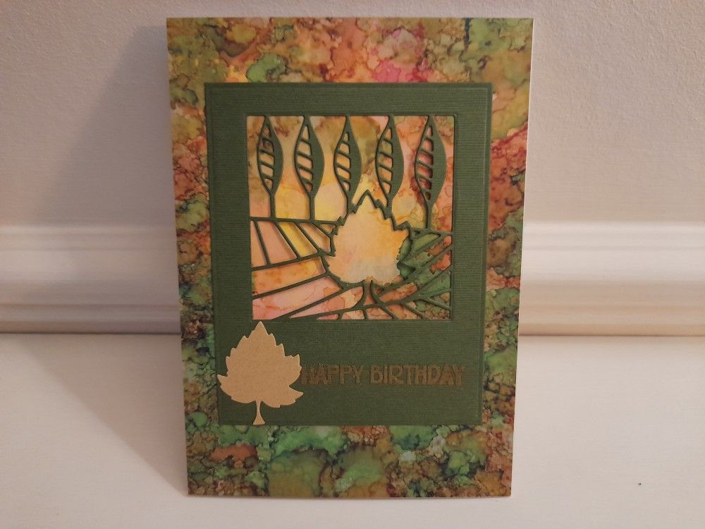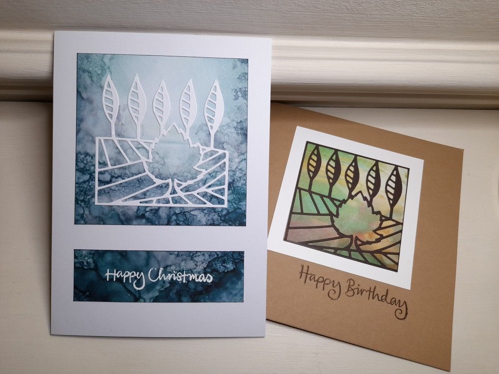 I then attached it to a piece of the ‘Antarctica designer card, and cut around it to leave a border. I did it this way round so that I could be sure of getting the die cut positioned exactly where I wanted it on the card, so the trees sit above what looks like a horizon on the card.
