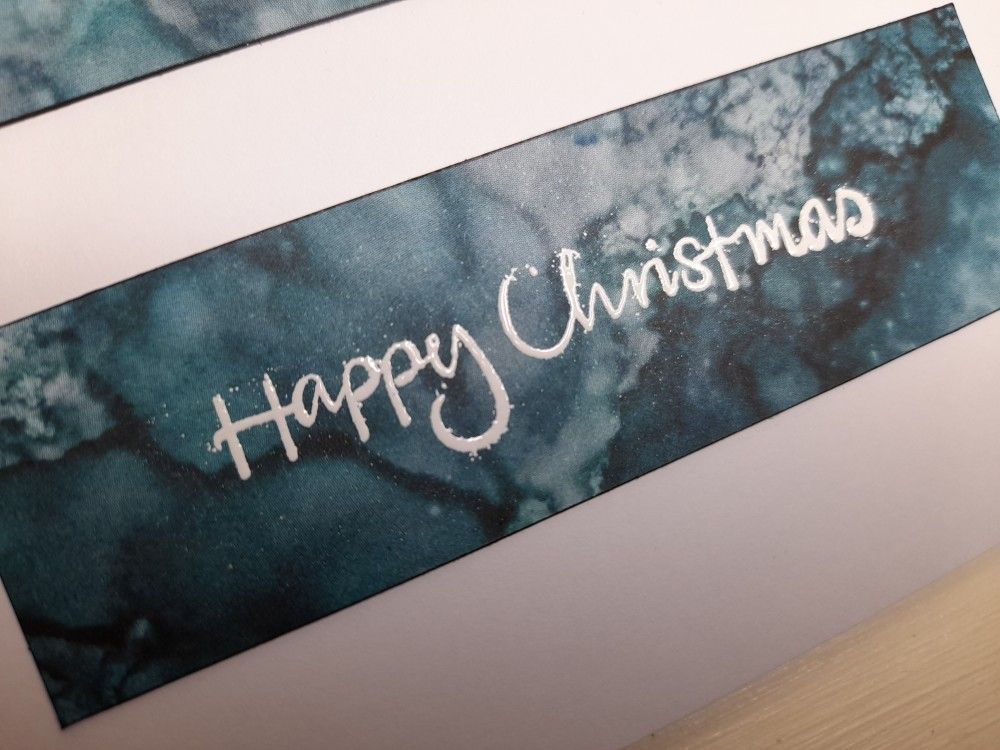 I trimmed the remaining card into a strip the same width as the mounted image, and stamped ‘Happy Christmas’ in Barbara’s Handwriting, embossing it with white WOW powder.