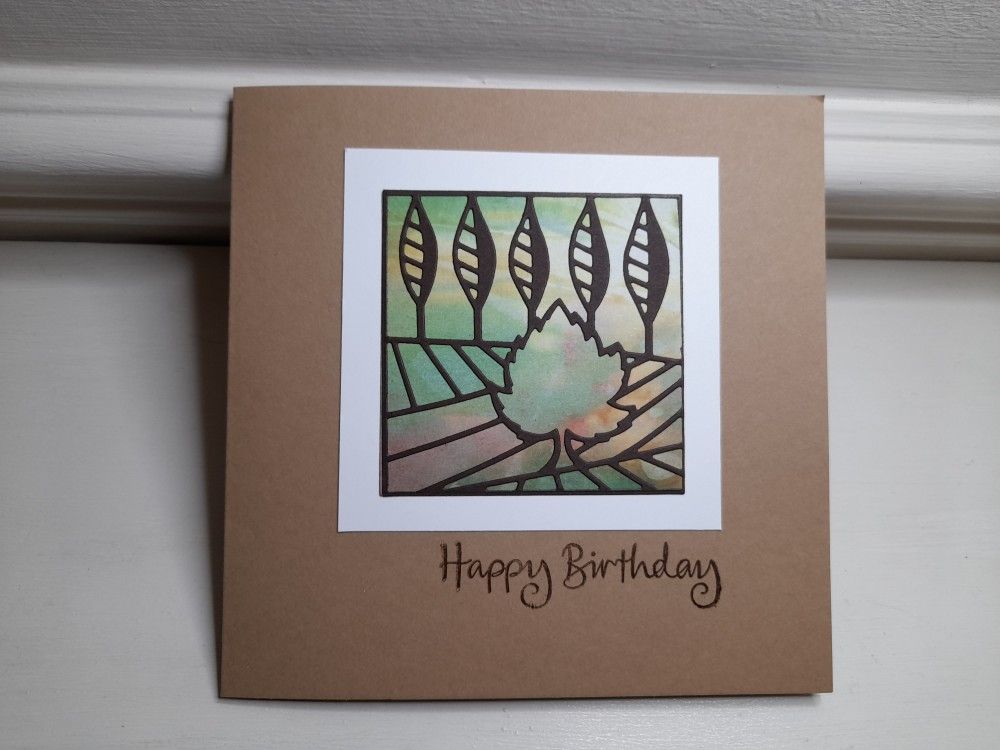 For the second card, I cut the die into a piece of brown card, and then trimmed it down to a narrow border using one of the square nesting dies. I stuck it to a piece of the ‘Rainbow River’ designer paper, positioning it so the light was in the sky, and then recut it with the square die. I then mounted it onto a square of white card before attaching the whole image to a 6×6 kraft card blank.