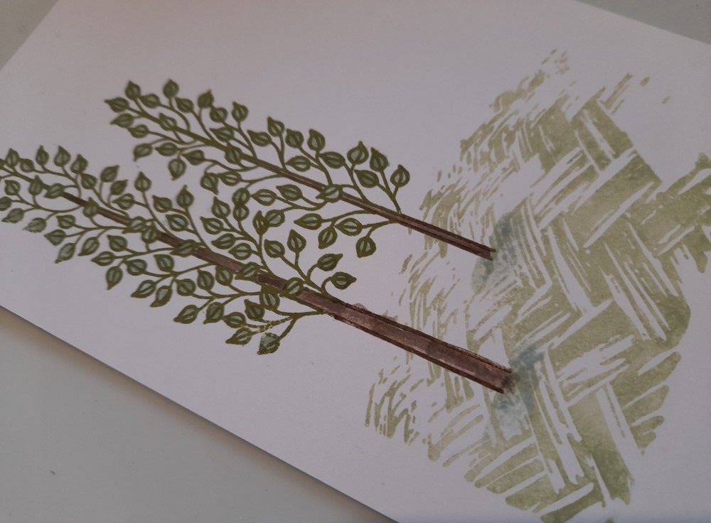 On to today’s first card. I decided it would make a good ground effect, so stamped it onto white card using ‘bundled sage’ Distress Oxide, and then added a couple of tall trees, stamping in Archival fern green for foliage and potted soil for the trunks. I’m not sure what set these are from – I’ve had them for quite a while and can’t see them on the Clarity website.