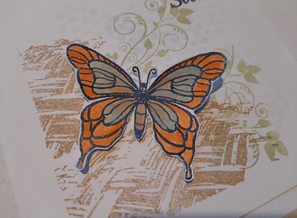 I found the butterfly stamp, that I’ve also had for years and is now part of the ‘leafy swirls’ stamp set. I stamped it in ‘cobalt’ Archival and then watercoloured it using ‘bundled sage’ and ‘ripe persimmon’ Distress Oxides. I blended the colours a bit on the wings to tone them together. I cut the butterfly out by hand and then glued it onto the topper, before adding the sentiment (another really old one) and attacheing it to a 6×6 card blank